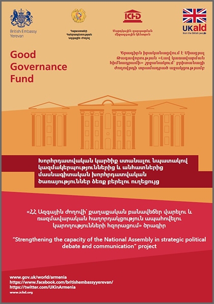 This Guidebook has been developed within the framework of “Strengthening the capacity of the National Assembly in strategic political debate and communication” project. The project is implemented by the International Center for Human Development nongovernmental organization within the framework of UK’s Good Governance Fund, with support of the British people.